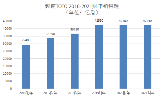 數據顯示,TOTO近年在越南的銷售額整體平穩(wěn)。2019財年突破40000億盾(約人民幣12.00億元)后,2020、2021財年均在42000億盾以上,其中2021財年還是越南疫情反彈較嚴重的一年,這一年TOTO在越南的營業(yè)利潤大幅減少65%。不過,正如TOTO建設第四工廠不僅為了越南市場,近年越南工廠的產品也大量出口海外市場。以2021財年為例,這一年TOTO在越南的銷售額為42440億盾(約人民幣12.73億元),其中外部顧客銷售額達到14390億盾(約人民幣4.32億元),占比超3成。